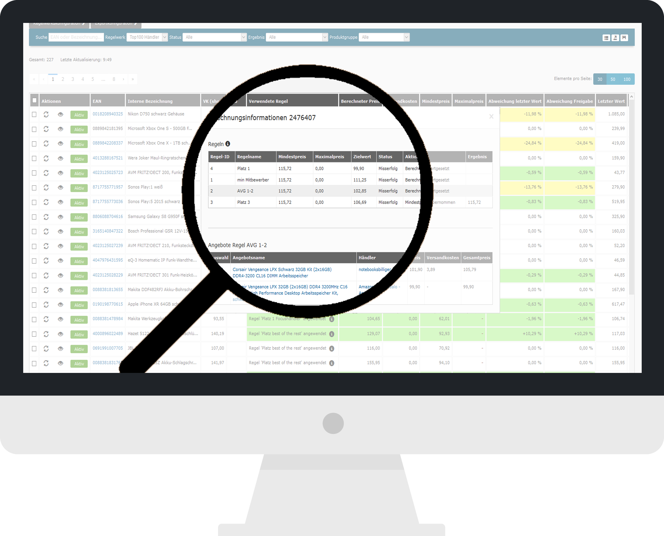 With dynamic pricing from PreisHoheit® you experience maximum control over your pricing. The control of minimum and maximum prices prevents unwanted price thresholds from being undercut or exceeded in the automatic calculation. The optional release control gives you additional security over the calculated prices.